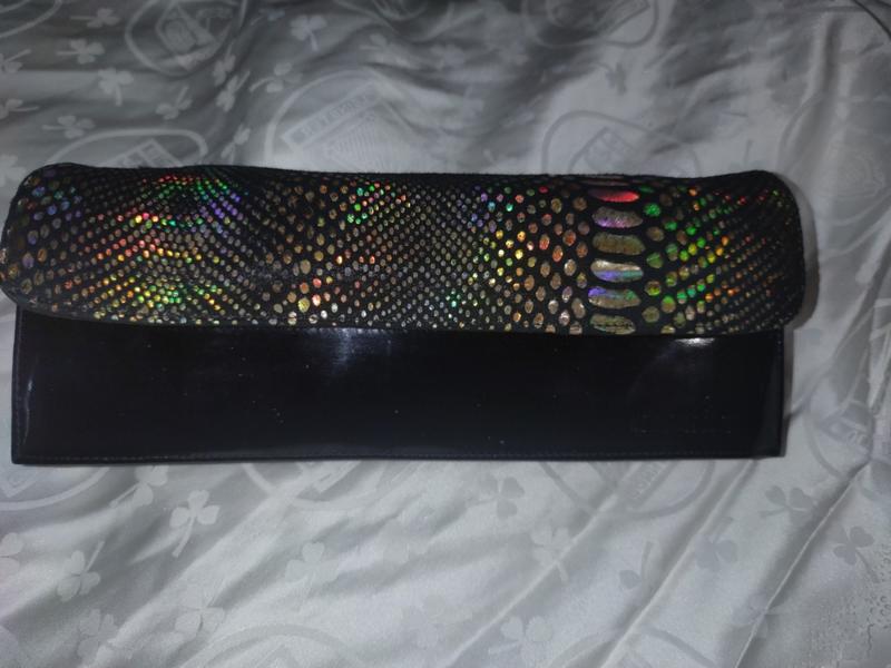 Вечерний нарядный клатч. Черный лак в сочетании с лазерным принтом на замше. Магнитные застежки и молния работают. Размер 30 х 12.