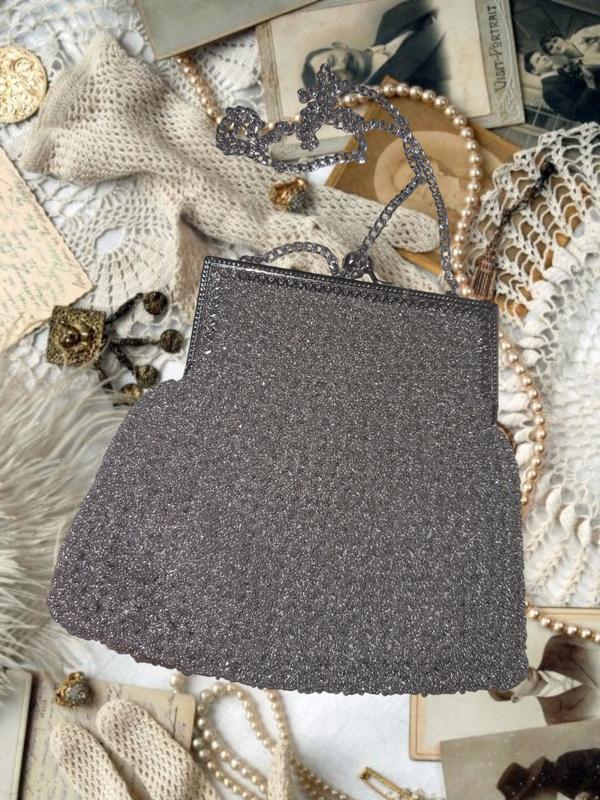 В'язана сумочка-клатч срібного кольору ручної праці в дуже доброму стані. Висота з ручкою 58 см Розмір сумки : Висота 18 см, ширина 20 см(по низу),шир.по верху каркасом 14 см.