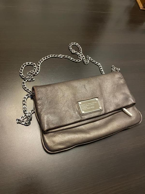 Клатч из натуральной кожи сего цвета. Оригинал Marc Jacobs . Ширина 27,5 высота в сложенном виде 16,5, в развернутом - 30. Внутри одно отделеоие и внешний карман с магнитнлй застежкой.. цепочка для ношения через плечо в комплекте. Состояние хорошее, нюансы на фото. Кожу можно при желании покрасить. Все учтено в цене