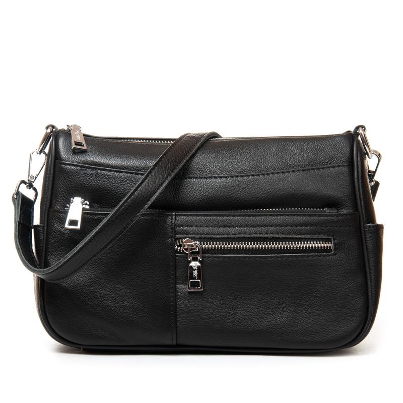 Выполнена из натуральной мягкой кожи. Закрывается на молнию. Внутри расположено основное и дополнительное отделение, разделенное карманом-перегородкой на молнии, открытый большой карман и боковой карман на молнии. На фасаде расположены два кармана на молнии, а на обратной стороне один карман. На торцах сумочки есть маленькие открытые карманы. Регулируемый плечевой ремень и съемная ручка. Размер (см) 28*18*12, высота ручки 30 см.