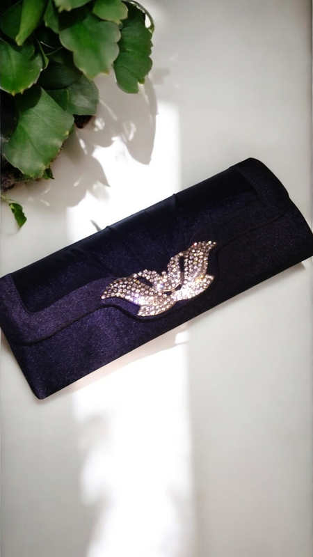 Необычайно красивый клатч выполнен в классическом стиле. Темно- синего цвета, который нежно мерцает яркими огоньками при ярком свете. Застежка кнопка-магнит покрыт камушками. Изделие с одним внутренним отделением. В комплекте аксессуара прилагается цепочка для ношения сумки на плече и маленькая текстильная ручка для ношения в руках. Размеры: длина - 26 см, высота - 11 см, ширина - 5 см.