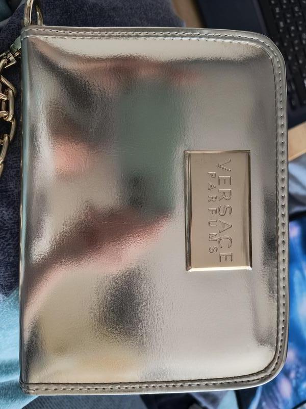Женский клатч на молнии. Изготовлен из искусственной кожи, в середине - текстиль. Есть два отделения для банкнот, монетница на молнии, картхолдер и место для мобильного телефона. Носится как в сумке, так и отдельно за металлическую цепочку. Шов в комплекте с парфюмом VERSACE.