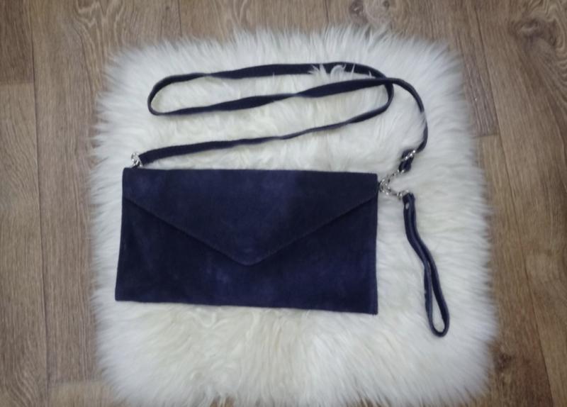 Состояние новой вещи. Сумка, клатч из натуральной замши благородного темно-синего цвета. Сумка просто лежала, не носили. Куплена и привезена из Италии. Лёгкая, удобная, стильная, модная и трендовая. Отличного качества подкладка внутри. На одно отделение, на змейке и на застежке. Самой сумки размеры: 30см*15,5 см. Плюс две ручки- на плечо и на кисть руки. Отличная идея для подарка. Возможна доставка укр или новой почтой после предоплаты на карту. Пишите.