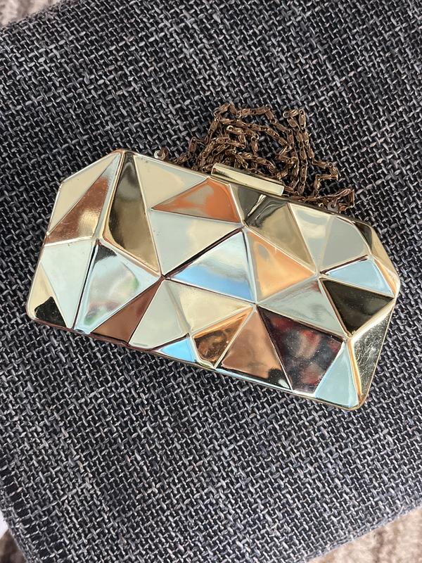 Стильный золотой клатч ✨ Продам вечерний клатч золотистого цвета. Оригинальный геометрический дизайн, металлический корпус, удобная застежка. В комплекте есть тонкая золотая цепочка для ношения на плече. Отлично подходит для праздничных мероприятий, вечеринок или выпускного.