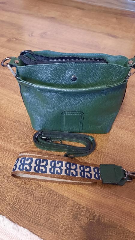 маленькая но очень вместительная кожаная сумочка,красивого насыщенного зеленого цвета,,мает целых три ручки, маселка чтобы в руке держать,тонкий ремешок который регулируется и широкий пасок.размер : высота 18 см,ширина 24 см.внутри на молнии, по бокам закрывается на кнопки.три отделения.