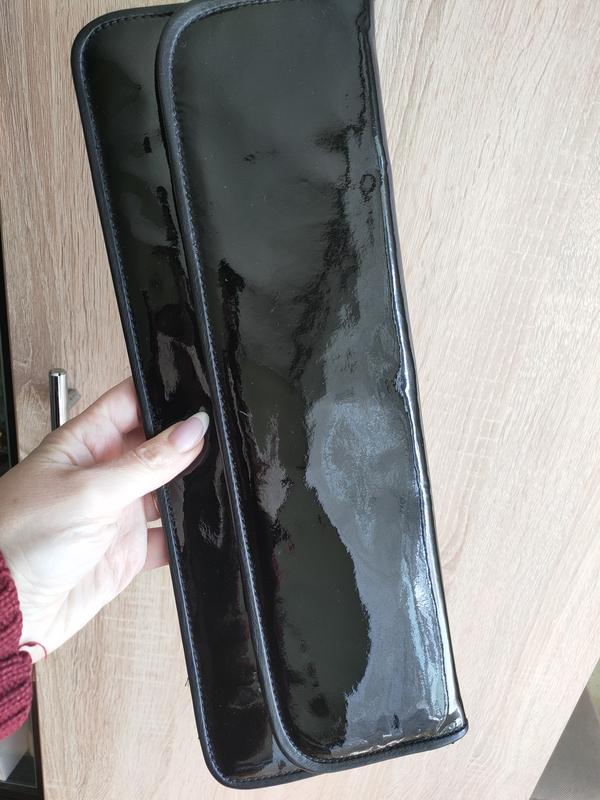 Клатч из нутуральной кожи итальянского бренда, лак плюс внутри замш. Без цепочки. Его там и не было при покупке в магазине. Внутри карман бедер молния и открытый карман. Застегивается на две кнопки. Ширина 35, высота 13 см. Состояние хорошее. Эффекты отсутствуют. Так как это лак, можно дополнительно его натереть, чтобы блеск лучше был.