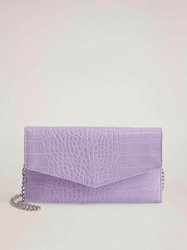 Клатч Mango. Клатч выполнен из искусственной кожи с тиснением под рептилию. Детали: застежка на кнопку, 2 отделения для купюр, 4 слота для карт, серебристая цепь. Цвет фиолетовый Цвет фурнитуры серебряный Высота 12 см, ширина 21 см.