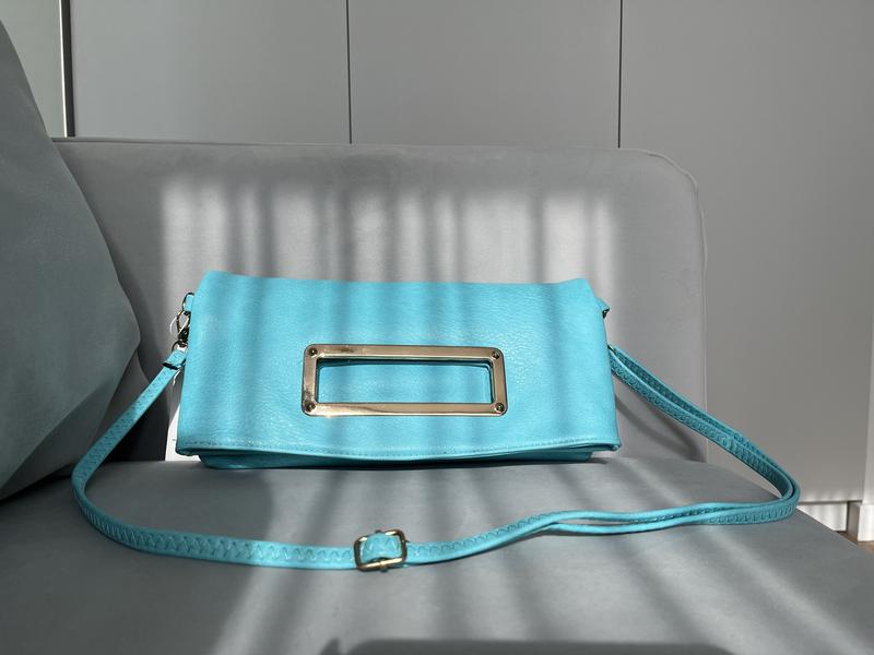 Жіночий клатч бірюзового кольору. Стильний аксесуар як для вечірнього виходу так і для щоденного використання. Сумочку можна носити у трьох варіантах: як клатч, через плече, та у руці тримаючи за золотистий обідок. Ремінець можна зняти. Закривається на блискавку. У середині одне головне відділення, плюс карманчик на блискавці, та ще пара карманчиків без блискавки. Розмір клатча: 16*30 см. Розмір розгорнутого варіанта сумочки: 30*30 см.