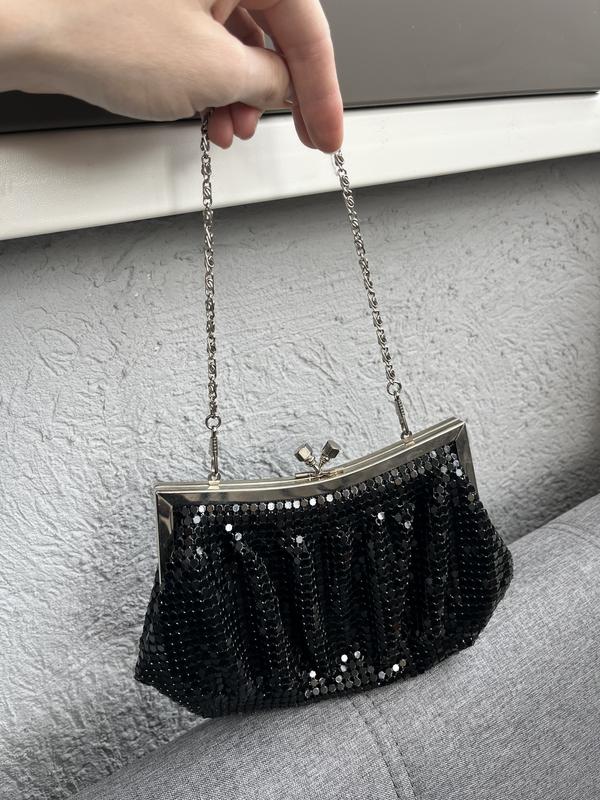 Сумочка клатч, чорного кольору, ручка на срібному короткому ланцюжку, знімається. Фурнітура працює справно, срібного кольору. В середині тканина чорного кольору, без дефектів.
