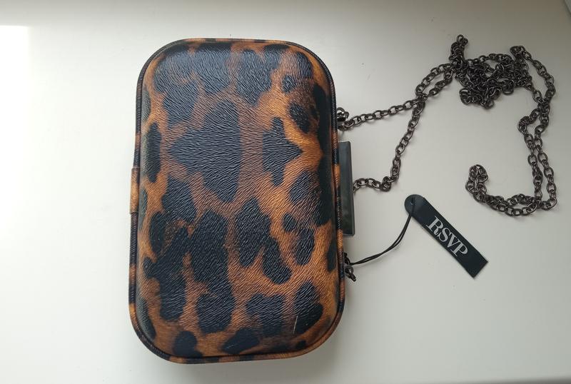 Мини-клатч RSVP с жестким футляром, текстурированный леопардовый принт. атласная подкладка, съемный плечевой ремень-цепочка. Примерные размеры: 16X10X5 см. Цена соответственно.