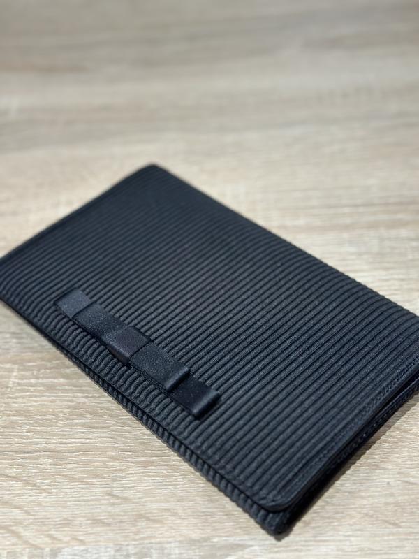Чорний клатч. Мʼяка приємна тканина. Шлейок немає. Ширина 20, довжина 13. Ззовні ідеальний стан , лише всередені є трохи пошкрябини, які не дуже видно. Всередині є маленька кишенька. Декор - бантик.