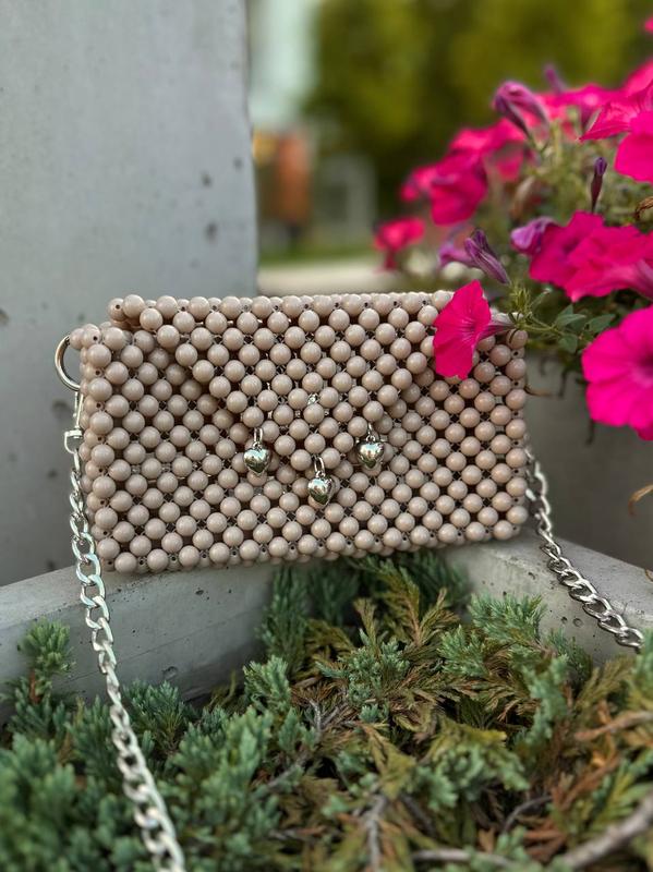 Бежевая сумка из бусин ручной работы, с длинной цепочкой.