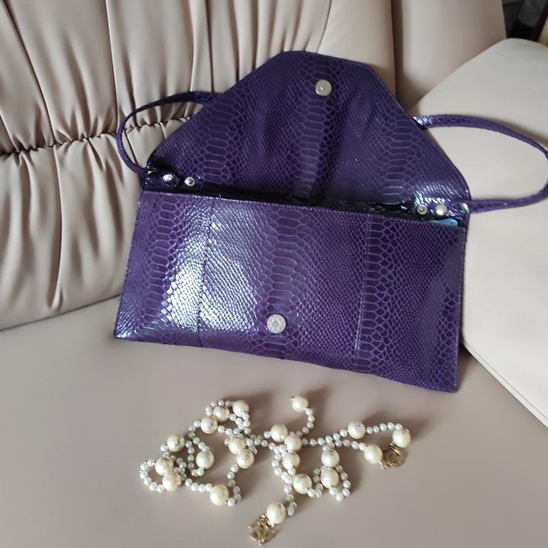 Новый клатч без бровей, хорошая шучная кожа с "змеиным принтом" баклажановый оттенок, есть длинная ручка-поясок на плечо на кнопках-80см длина *высота = 37*18 см