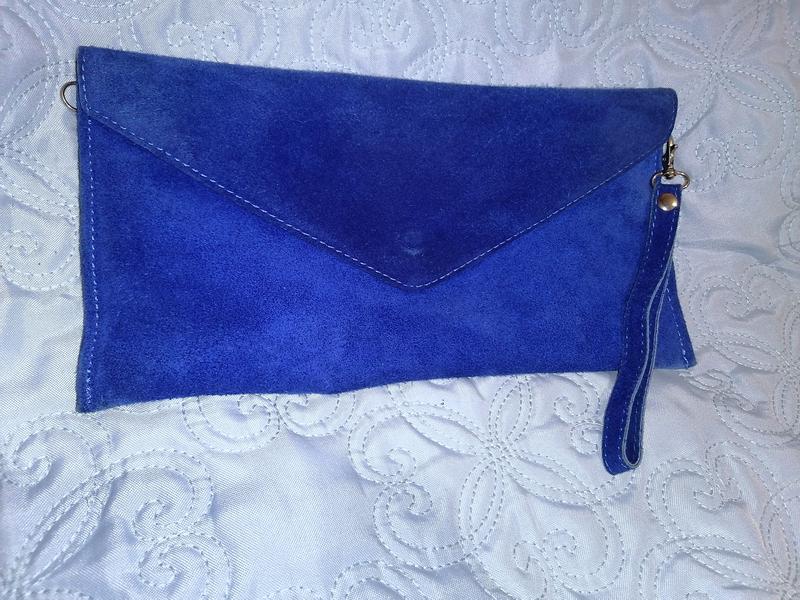 Клатч из натуральной замши. Красивый цвет. Снаружи замша слегка изменила цвет. Застежка магнит. Петля на руку, можно перестегнуть на удобную сторону. Подкладка плотная, без повреждений. Эффектов, трещин нет.