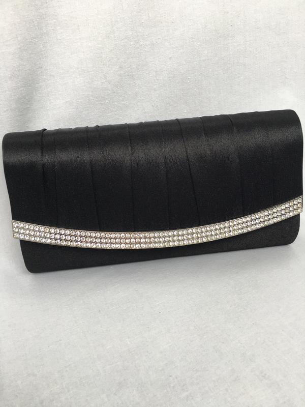 Нова маленька сумка-клатч AMINTA Має у комплекті дві ручки Каркасна, у середині маленька кішеня Застібка кнопка-магніт Декорована попереду планкою з кристалами Висота 10,5 см Ширина 20,5 см Довжина ручки 35 см Довжина ланцюжка 107 см
