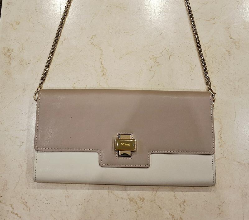 Клатч Furla оригинал, цвет бежевый и какао, золотая фурнитура, длина 26 см, высота 14 см, ширина 2 см., натуральная кожа.