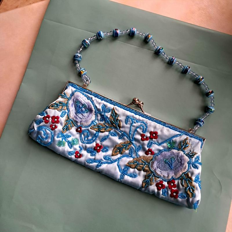 ✨ Изысканный голубой клатч с вышивкой бисером ✨ Нежный атласный клатч с деликатной ручной вышивкой – настоящая находка для ценителей элегантности. Материал – голубой атлас, украшенный бисером и нитками в цветочном орнаменте. Ручка-цепочка длиной около 37 см выполнена из декоративных бусин в тон, застежка – серебристая металлическая с эффектом ретро. 🔹 Размеры: – длина – 25 см – высота – 10 см - Ланцюжок-37 см. – ширина входа в открытом виде – 20 см Внутри - небольшой кармашек с надписью Schild. Состояние — очень хорошее, почти идеальное, без пятен или повреждений. Идеальный аксессуар для вечера, торжеств или романтических прогулок – подчеркнет нежность и изысканность вашего образа 💎