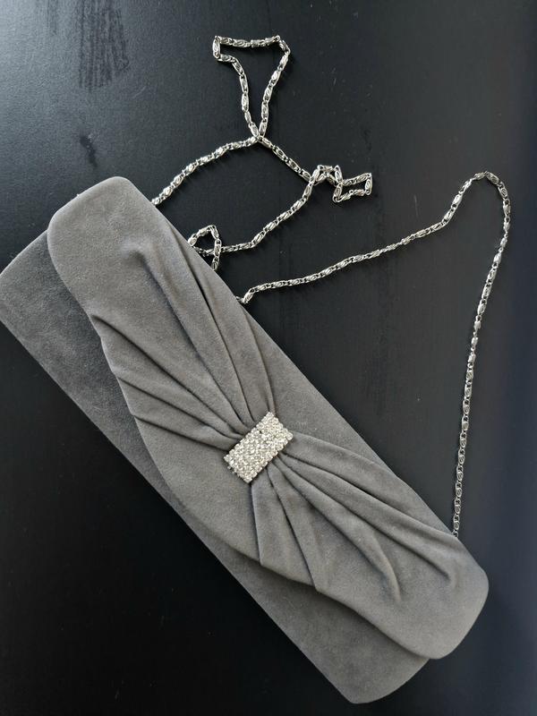 сірий під замшу клатч вигуляла 1 раз. заміри 28 см на 12 см. на кнопці. телефон помада та ключі поміститися.