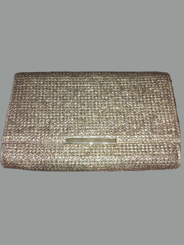 Бренд: H&M Колір/Оздоблення: Золотистий/Шампанське. Сумка має блискучу, металізовану, текстуровану зовнішню поверхню, яка виглядає як плетіння або сітка, що відбиває світло. Цей вигляд робить її ідеальною для вечірніх подій або святкових випадків. Форма: Прямокутна Спереду має гладку металеву планку (застібку/декоративний елемент), яка додає витонченості