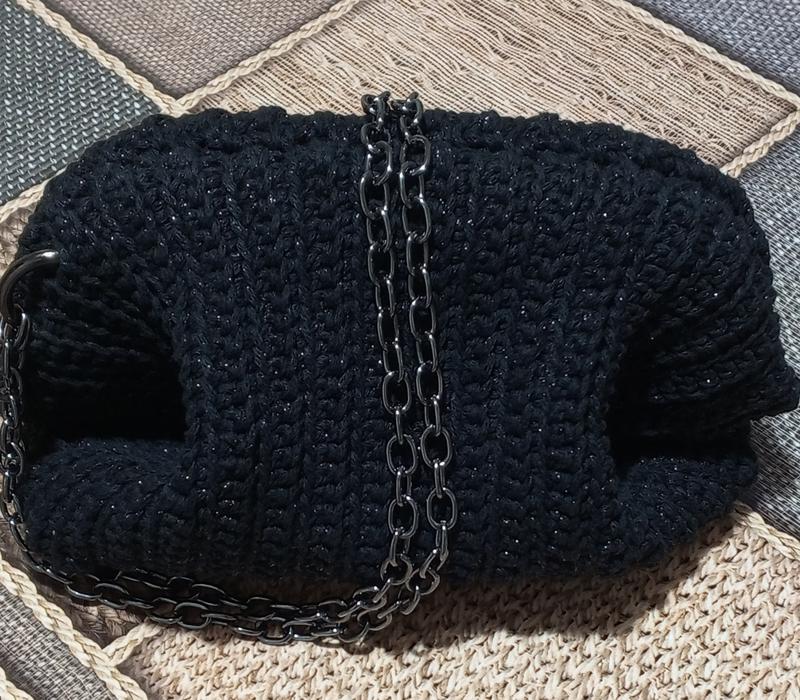 Сумка-клатч, ручной работы. Сумка имеет мягкую, объемную форму, напоминающую стиль "облака". Она связана крючком из черного полифирного шнура с добавлением люрекса, что придает ей мерцающий эффект. Есть подкладка красного цвета. Есть в качестве ручка металлическая цепочка, прикрепленная к сумке металлическими кольцами. Размер: Длина -22 см,. Высота - 15 см., Фермуар размер: 20 см ( горизонт) 15 см.( вертикаль)