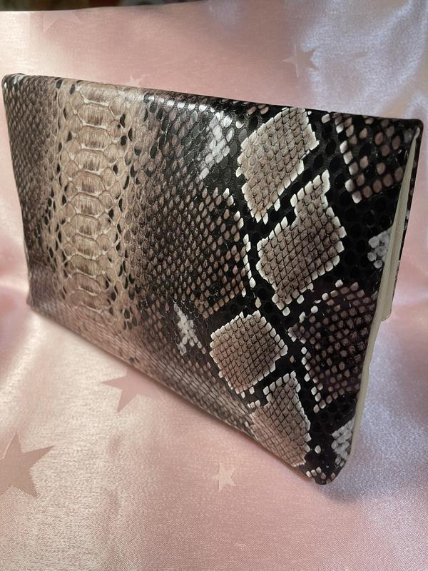 Клатч - сумочка с принтом питона с одной стороны ,с другой бежевая эко-кожа.Закрывается на змейку и на магниты.Внутри подкладка и одно боковое отделение.Размеры 26 • 18 • 3 см в сложенном виде, 28 • 26 в разложенном виде.Внутри на сгибе есть небольшие трещинки, есть на фото.