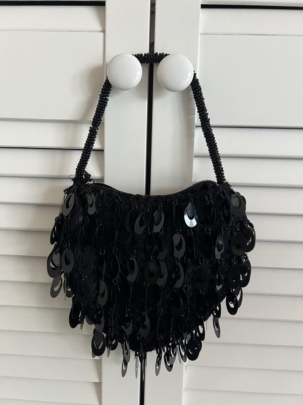 Маленька вечірня сумочка в паєтки. Ідеальний стан. Застібається на блискавку. Довжина ручки 30см. Висота сумки 15см., ширина по середині 18см.