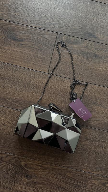Формений клатч на цепочці з чорною ьархатноб підкладою Сталевого кольору з верхньою масивною застібкою