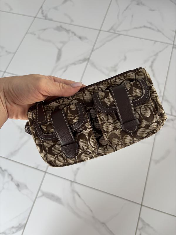 Це мініатюрна сумка або клатч Coach із фірмової Coach з монограмою та шкіряними акцентами. Модель виконана у вінтажному стилі, має дві передні кишені із застібками-пряжками та коротку ручку-ремінець.
