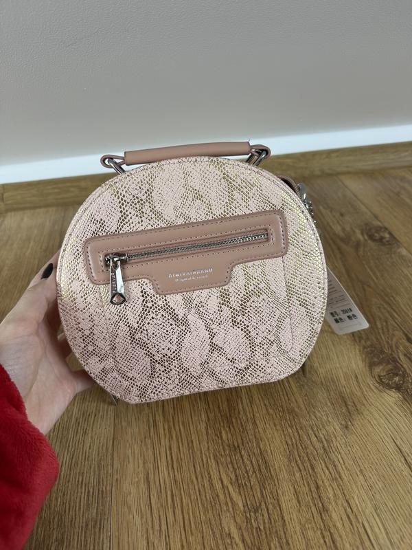 Ця сумка має досить стильний та неординарний вигляд завдяки поєднанню класичної форми та яскравої текстури. Ось детальний опис: Загальні характеристики • Форма: Сумка має трендову кругла форму (так звана «сумка-таблетка»), яка додає образу жіночності та оригінальності. • Колір та принт: Основний колір — ніжний пудрово-рожевий. Поверхня оздоблена ефектним зміїним принтом (пітон) із золотистим напиленням, що створює легкий металевий блиск. • Бренд: На передній частині є фірмовий напис "AIMIYAI BRAND — Original Riveted". Деталі конструкції • Матеріал: Виконана з екошкіри або фактурного замінника з імітацією луски. Деталі (ручка, окантовка кишені) мають гладку матову текстуру. • Зовнішня кишеня: Спереду розташована функціональна горизонтальна кишеня на блискавці. • Фурнітура: Використана якісна металева фурнітура в сріблястому кольорі. Застібка на передній кишені має масивний та зручний пулер (бігунок). • Ручки: Сумка оснащена короткою жорсткою ручкою для носіння в руці. Також, судячи з кріплень з боків, до неї має додаватися довгий ремінець (ланцюжок або шкіряний пас) для носіння через плече. Стиль та призначення Завдяки золотистому відливу та зміїному принту, ця сумка може стати головним акцентом у монохромному образі. Вона чудово підійде: 1. Для вечірніх виходів або святкових подій. 2. Для стилю Casual, якщо хочеться додати «родзинку» звичайним джинсам і базовій футболці. У комплекті є ще довгий ремінець