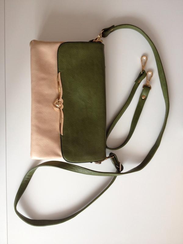 Сумка клатч в ідеальному стані 25/17/5 см (ширина/висота/глибина) з кож.заму гарної якості як шкіра, всередині багато відділів включно з потаємним карманом на замку, на зворотній стороні теж карман з замком, плюс дві знімні ручки довга та которка. Колір - беж та темна олива.