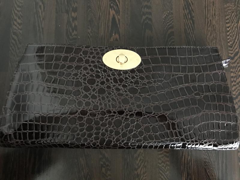 клатч жіночий шоколадно-коричневого кольору із штучної шкіри з тисненням під крокодила, металічна застібка лимонного кольору та додатковою блискавкою, розмір 37 низ, 32 см верх, висота 18 см абсолютно новий, на фото за підкладці видно; або подарую при покупці в мене товарів від 400 грн