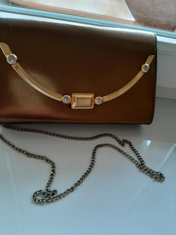 Золотистая сумочка - клатч на цепочке, очень вместительная( помещается телефон, пудренница, помада и т. п.) Использовалась несколько раз на праздничные мероприятия. Бесплатной доставки нет !!! Отправлю любым перевозчиком после 100% оплаты на мою карту!!! Порядочность гарантирую - читайте отзывы о моих продажах !!!