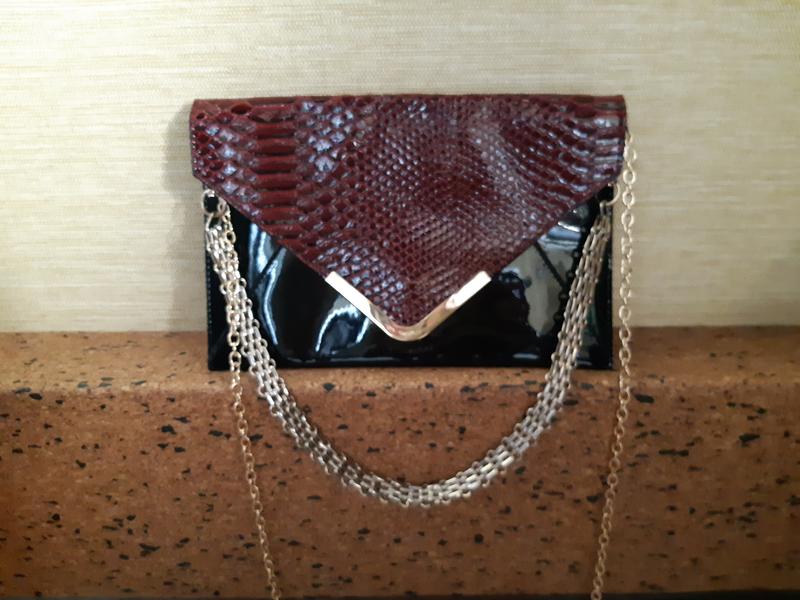 Новый итальянский клатч. Лаковая кожа. Дорогая шелковая подкладка Внутри одно отделение и карманчик на молнии Две золотые цепочки через на плече. Одна- широкая короткая. Вторая- ущкая длинная. Покупала в Эвропе за 150 $. Размер 26 см на 16 см.