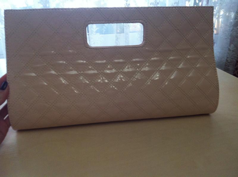 Сумочка клатч. Цвет нежно-розовый. Лаковая. С цепочкой. Длина сверху 37,5 см, снизу 40 см, высота 22 см Есть нюанс- следи от клея с внутренней стороны. Мало заметны. (Видно на фото)