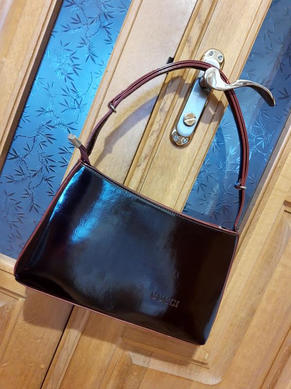 лаковая сумка-клатч, с незначительными дефектами под брэнд Gucci. есть небольшие, еле заметные царапины на поверхности и на дне, начал крошиться лак на ручках в точках присоединения к самой сумке, ручки можно заменить (все на фото указано). в целом очень хорошее состояние. ручки зафиксированы в одном положении. очень красивый цвет - темный бордо. высота - 18см, ширина в верху - 28см, внизу - 31см (трапециевидная форма). ширина основания - 6см. место для руки (высота ручки) - 21см