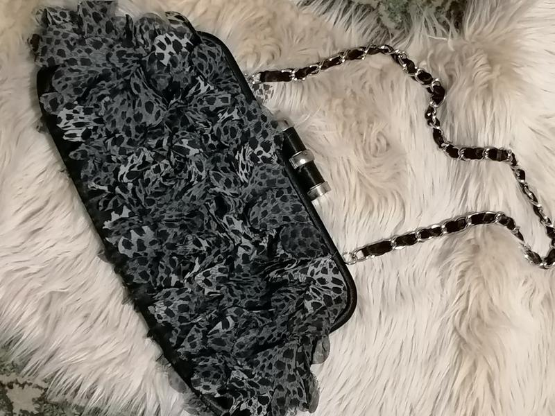 Сумка - клатч Syzy Smith👜✨з ручкою - ланцюжком Атласна сумка з шифоновими листочками всередині щільна, обшита тканиною, типу чорний атлас, точно не знаю матерію Одне відділення і кишенька Зручна застібка ширина внизу 31 см вгорі 22 см висота 15 см повністю довжина ручки 60 см
