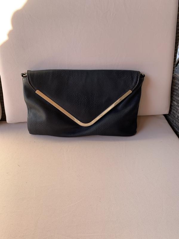 Клатч чорного кольору із золотою вставкою в гарному стані. Довга ручка в комплекті.