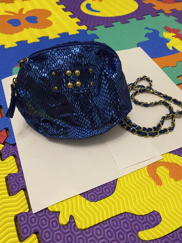 Маленька сумочка синього кольору під пітона. Має довгий ремішок. Форма кругленька. Дуже інтересна, можна використовувати як до вечірнього, так і до повсякденного наряду. Стан нової. Європейська якість, матеріал тканина під пітона.