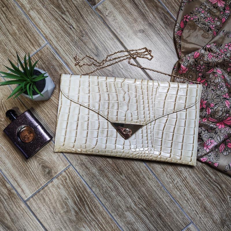 💝 Стильный клатч с тиснением под рептилию на тонкой цепочке. Цепочка снимается. Бренд не указан. Внутри одно отделение и маленький карман на молнии. Сумка не была в носке, на цепочке ещё осталась леска от бирки, но на подкладке есть розовое пятно, предположительно от фломастера. На фото видно. 📏 Замеры: ширина 36,5; высота 20, длина цепочки 108.