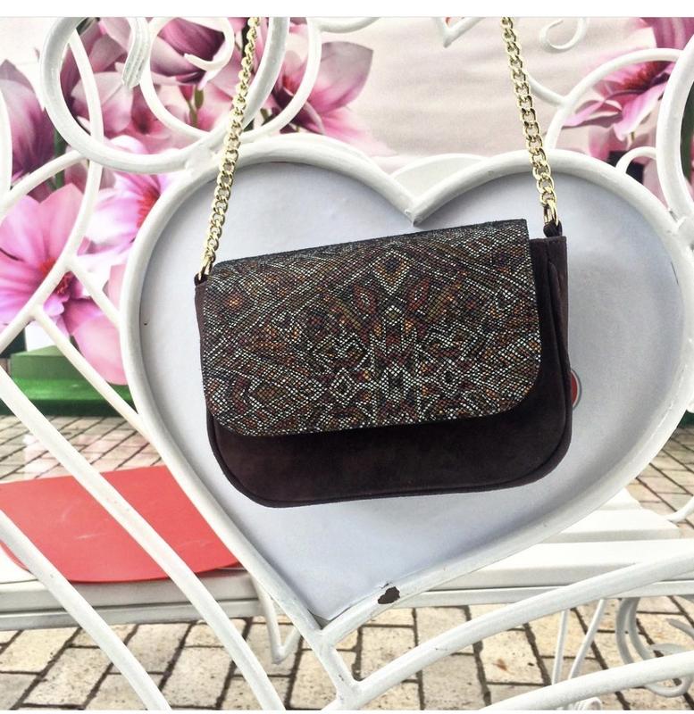 Сумочка из натуральной замши и кожи. Крепкая металическая ручка-цепочка . Закрывается на магнитной кнопке. Внутри текстильная подкладка Размер 15х20х4 см