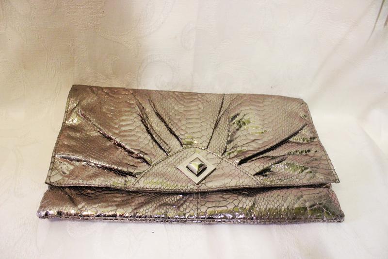 Серебристый клатч с оригинальной застёжкой. Размер 32х20 см