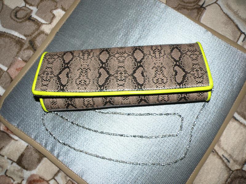 сумочка-клатч на ручке-цепочке, которую можно отстегнуть расцветки под рептилию, застёгивается на кнопку, не кожа замеры: 27х11 ручка 118см