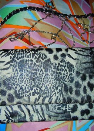 Клатч с анималистичным принтом, есть длинная ручка-цепочка и короткая. Из дефектов пожелтела когда терлась об одежду,есть пятнышко под крышкой еле заметное, и зеркало нужно заменить,не понятно что с ним случилось. Высота-16см,ширина-16см.