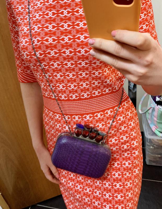 Клатч фиолетовый,есть тонкая цепочка. Очень красивая ,удобная. Состояние новой вещи.