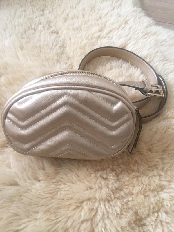 Поясна сумка, з двома ремінцями { пояс і довгий ланцюжок}. Золотистого кольору. Дуже стильна, гармонійно доповнить ваш образ.