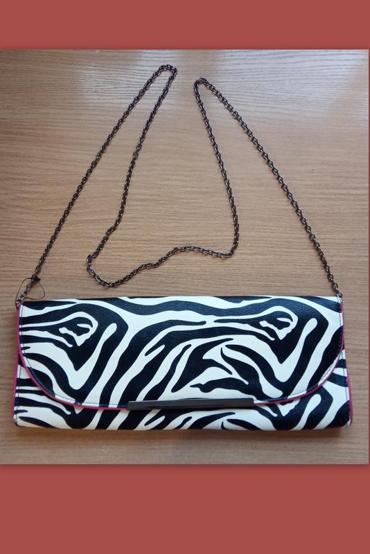 Сумка клатч зебра Next на длинной металлической цепочке с ярко-красной подкладкой, экокожа с легкой текстурой, внутри один маленький кармашек габариты 32 х 13 см, длина цепочки 125 см. (несъемная) нова, сток ВАЖЛИВО: отправка Укрпоштой возможна под Вашу ответственность, подробности в разделе "Про меня"