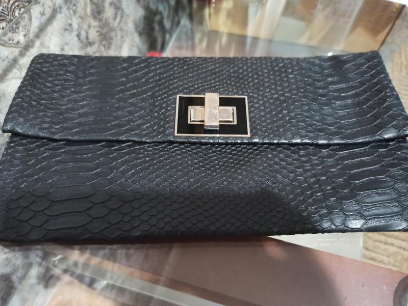Черный клатч под змеиную кожу. Есть возможность прикрепить ручку. Состояние хорошее, повреждений нет. Кармашек в средине со змейкой.