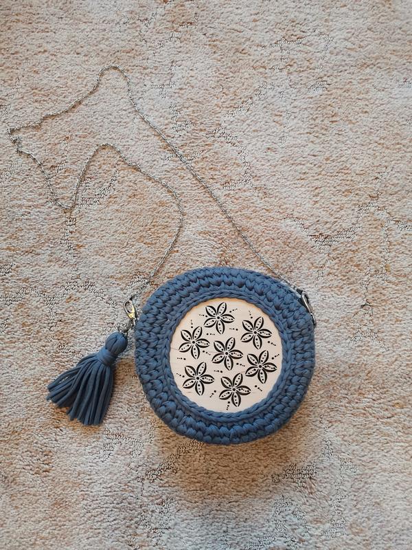 В'язана сумочка з трикотажної пряжі. Діаметр 22 см, ширина 10 см, ручка 120 див.