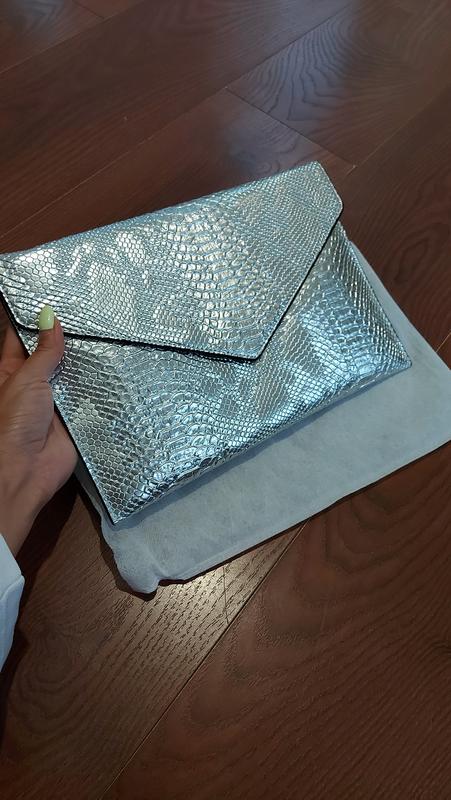 Клатч серебристый, размер на фото Заказывала с Али, предыдущий прослужил года 2, очень удобный, качество идеальное, кожа твёрдая. случайно заказала другого цвета, теперь продаю