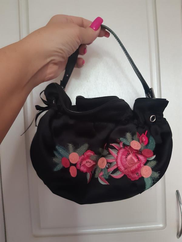 Нежная атласная сумочка с тканевой аппликацией и вышивкой Karen Millen. В использовании была 1 раз. Кожаная Ручка, застегивается на скрытый магнит, затягивается кисет. Ручка с двух сторон на застежках, можно совсем отстегнуть. Ширина 26, высота с рюшем 21, полезная высота 15. При покупке - выбирайте бесплатный товар в подарок)